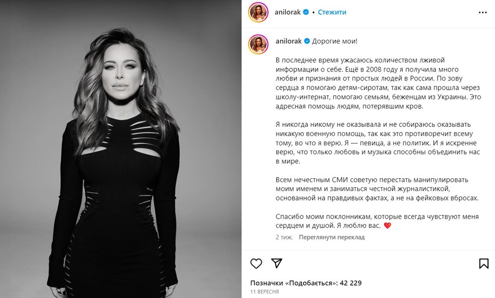 На странице Ани Лорак в Instagram отключены комментарии, поэтому люди не имеют возможности отреагировать на ее заявления. Певица время от времени публикует посты, в которых пишет о своей любви к детям и намерении их защищать. Также уверяет, что ни копейки из ее денег не потрачено на помощь Силам обороны — говорит, что о ней распространяют "ложь".