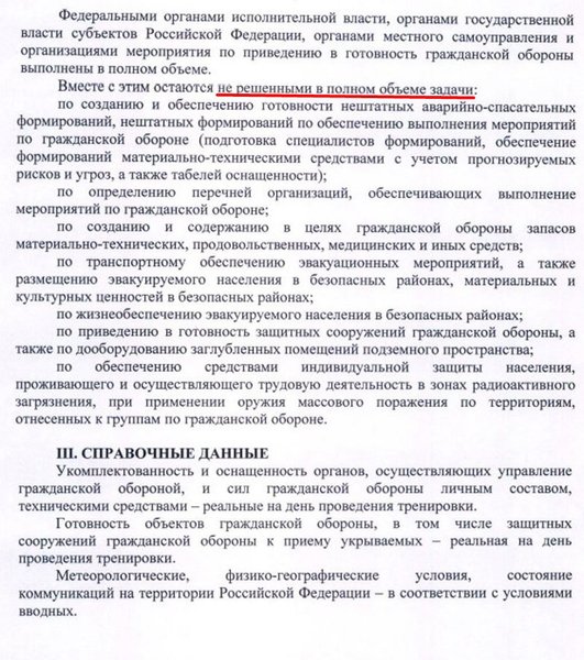 В документе указано, что якобы на территории "отдельных субъектов" РФ произошло несколько ядерных взрывов. При этом взрывы — следствие "применения противником современных средств поражения дальнего действия", которое произошло из-за "роста напряженности рядом с границами РФ".