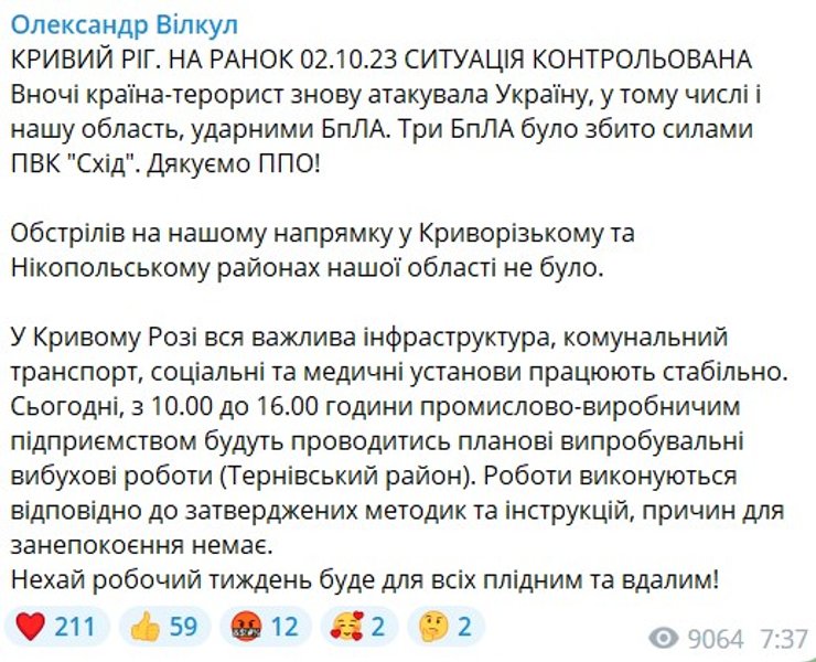"Там [на Криворожье — Ред.] 3 дрона уничтожены, и один уничтожен на Херсонщине, но есть и попадание в одно из промышленных предприятий. Ударили дроны и на Херсонщине. Опять повреждена чисто гражданская инфраструктура — заводы сельскохозяйственного предприятия".