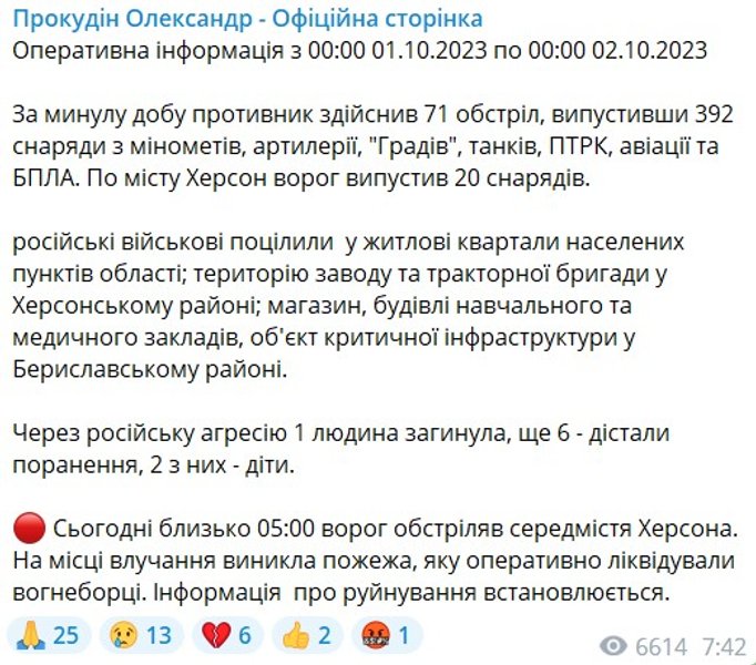 Мэр Кривого Рога Александр Вилкул отметил, что дроны над городом были сбиты бойцами Воздушного командования "Восток". По его словам, враг не обстреливал громады Криворожского и Никопольского районов. Глава Херсонской ОВА Александр Прокудин указал, что россияне запустили по области 392 снаряда: били из минометов, РСЗО "Град", танков, ПТРК, авиабомбами и дронами-камикадзе. В результате утреннего попадания начался пожар на сельскохозяйственном предприятии. Инфраструктурный объект, поврежденный РФ, расположен в Бериславском районе. За сутки пострадали семь человек: погиб — 1 человек, ранены — 6, из них — двое детей.