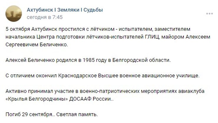 В российских соцсетях 6 октября появилась информация о гибели летчика-испытателя майора Алексея Беличенко, который погиб 29 сентября. По мнению обозревателей "Милитарного", это как раз тот летчик, который управлял самолетом Су-35, сбитым в результате дружественного огня в небе над Запорожьем.