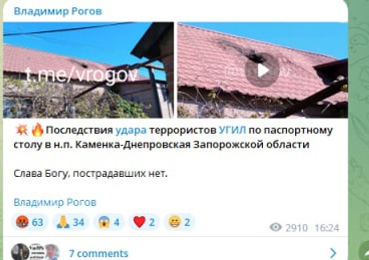 Представитель оккупационной администрации Запорожской области Владимир Рогов сообщил, что в результате атаки дрона СБУ пострадавших нет.