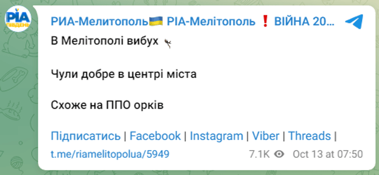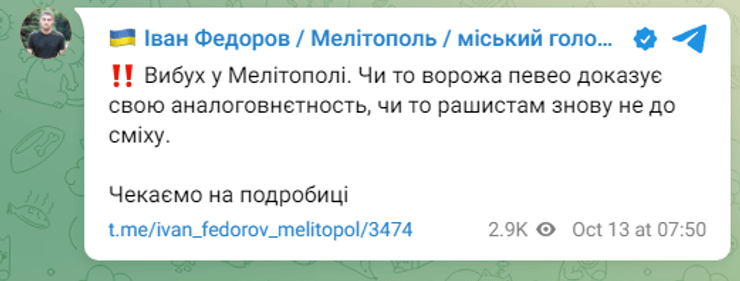"Взрыв в Мелитополе. То ли вражеская "певео" доказывает свою "аналоговнетность", то ли р#шистам опять не до смеха. Ждем подробности", — сообщил городской голова.