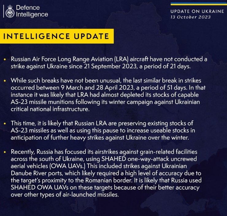 Самолеты дальней авиации (ДА) ВКС России не наносили ударов по Украине с 21 сентября 2023 года, то есть в течение 21 дня. Вероятно, воздушные силы оккупантов исчерпали запасы своих крылатых ракет Х-101, и теперь намерены накопить их количество в преддверии зимних атак по критической инфраструктуре Украины. Об этом 13 октября сообщила пресс-служба Министерства обороны Великобритании.
