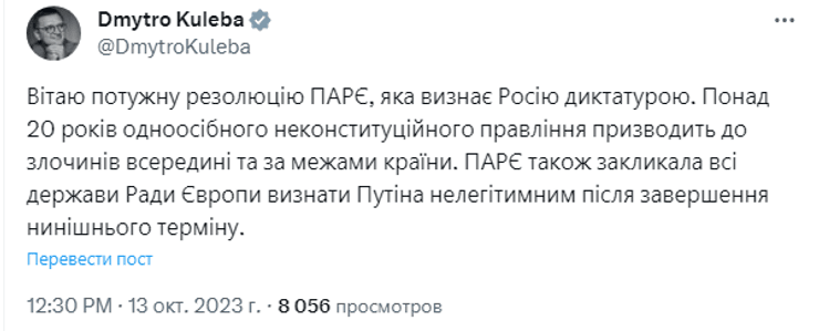 "ПАСЕ также призвала все государства Совета Европы признать Путина нелегитимным после завершения нынешнего срока", — добавил Кулеба.