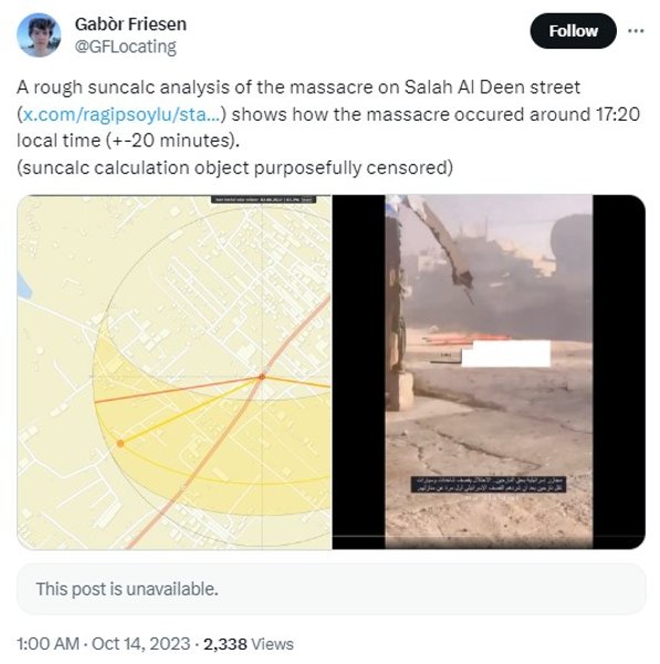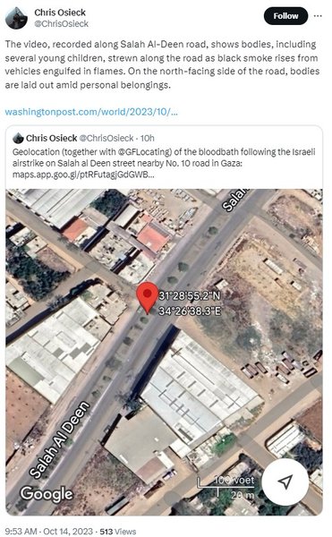 Американские журналисты пишут, что по данным исследователей Криса Осика и Габора Фризена, трагедия произошла на шоссе Салах Аль-Дин. Осинтеры определили геолокацию происшествия и опубликовали соответствующую информацию в Twitter.