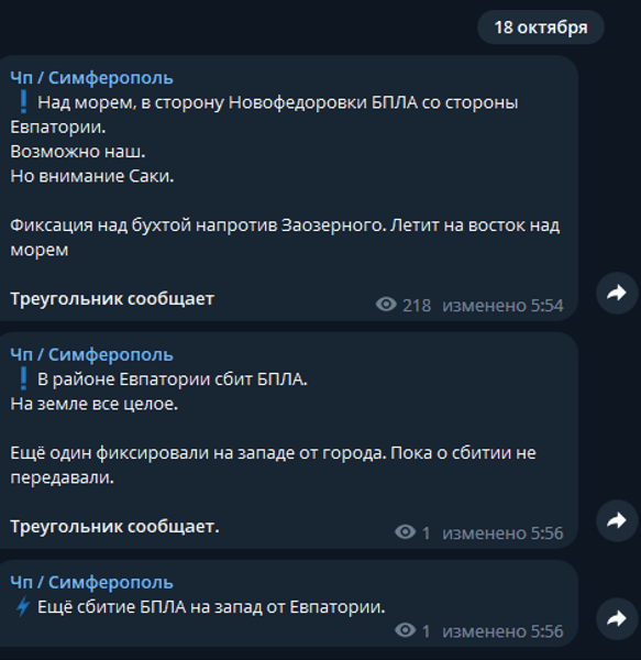 Вместе с тем в российских Telegram-каналах сообщают об атаке беспилотников. По их утверждениям, якобы БПЛА был сбит над Евпаторией и еще один — западнее города.