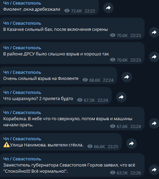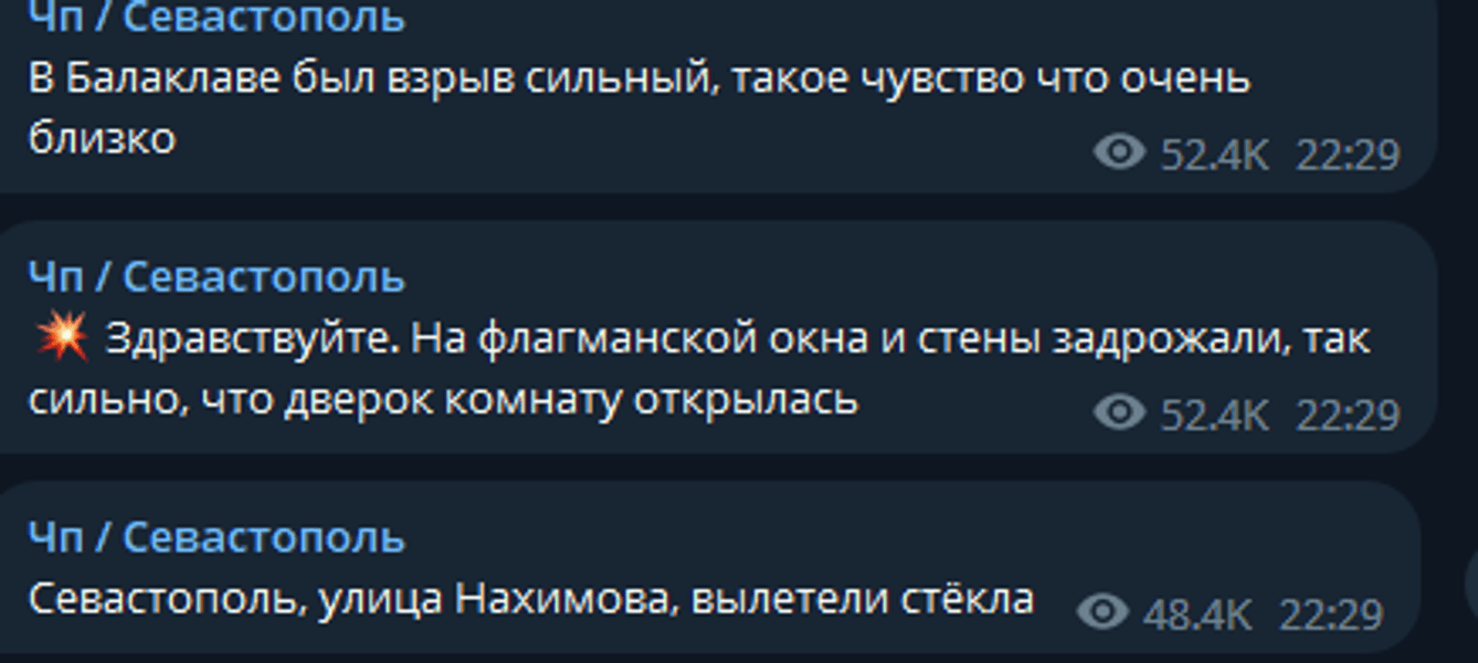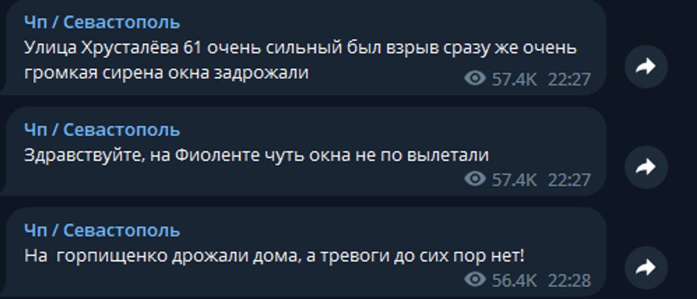 В местных пророссийских Telegram-каналах также сообщают о двух взрывах. По сообщениям местных жителей, от взрывной волны в некоторых квартирах выбило окна. Некоторые писали, что после этого так и не услышали сирену. Сообщается, что громче всего было в микрорайоне Балаклава.