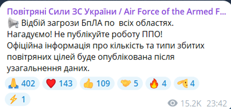 Позже в военной администрации снова сообщили о работе противовоздушной обороны. О 23:46. Воздушные силы объявили об отбое угрозы БпЛА по областям.