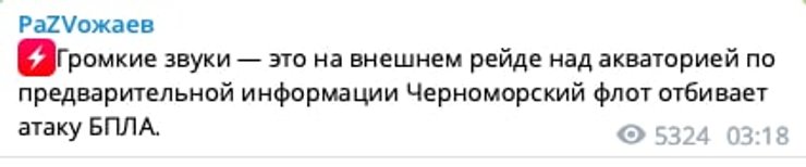 "Громкие звуки — это на внешнем рейде над акваторией по предварительной информации Черноморский флот отражает атаку БпЛА", — проинформировал он.