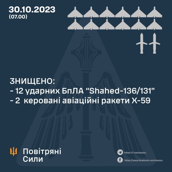 В ночь на 30 октября 2023 года российские оккупанты атаковали территорию Украины 12 ударными БпЛА типа "Shahed" и 2 управляемыми авиационными ракетами Х-59.