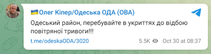 Глава Одесской областной военной администрации Олег Кипер предупредил жителей Одесского района о необходимости оставаться в укрытиях.