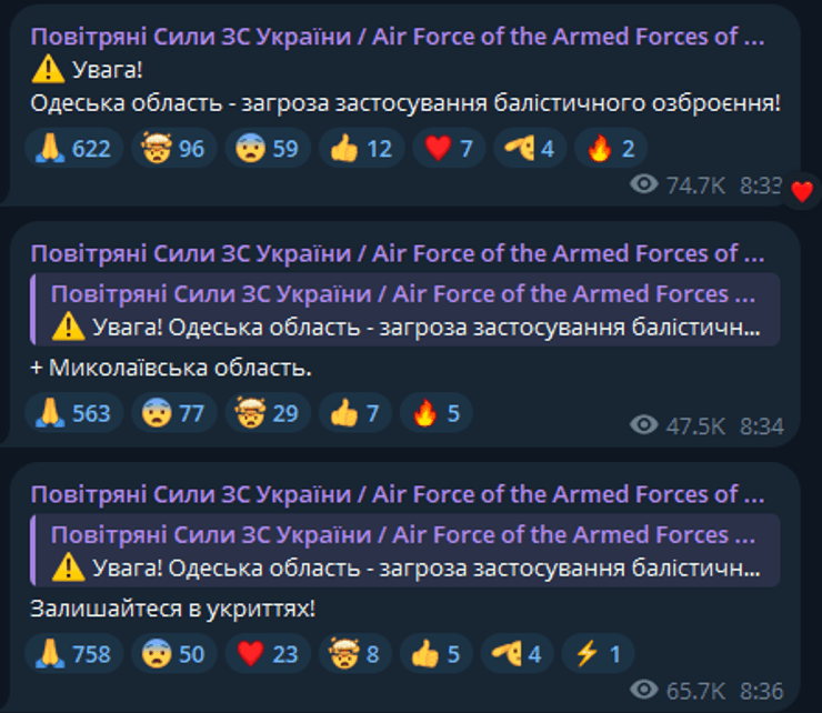 В момент объявления тревоги в Воздушных силах ВСУ сообщили об угрозе применения баллистического вооружения в Одесской и Николаевской областях.