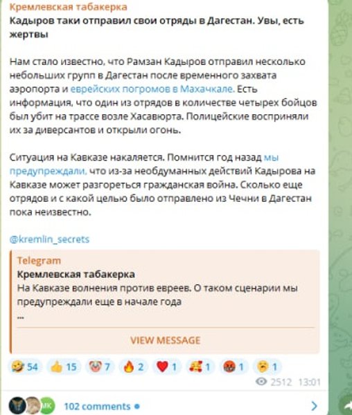 "Нам стало известно, что Рамзан Кадыров отправил несколько небольших групп в Дагестан после временного захвата аэропорта и еврейских погромов в Махачкале. Есть информация, что один из отрядов в количестве четырех бойцов был убит на трассе возле Хасавюрта. Полицейские приняли их за диверсантов и открыли огонь", — говорится в сообщении.