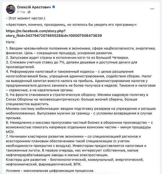 Бывший внештатный советник Офиса президента и блогер Алексей Арестович поделился своей "предвыборной программой". Об этом известно из его публикации в соцсетях от 1 ноября.