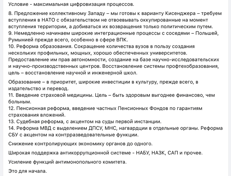 "Предложение коллективному Западу — мы готовы к варианту Киссинджера — требуем вступления в НАТО с обязательством не отвоевывать оккупированные на момент вступления территории, а добиваться их возвращения только политическим путем", — говорится в "программе".