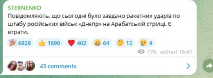 "Сегодня были нанесены ракетные удары по штабу российских войск "Днепр" на Арабатской стрелке. Есть потери", — проинформировал он.
