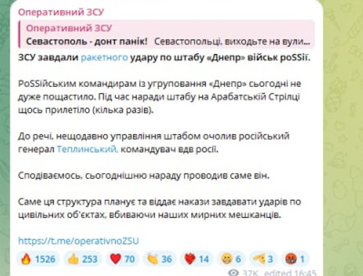 Важно"Российским командирам из группировки "Днепр" сегодня не очень повезло. Во время совещания штаба на Арабатской Стрелке что-то прилетело (несколько раз). Кстати, недавно управление штабом возглавил российский генерал Теплинский, командующий ВДВ РФ. Надеемся, сегодняшнее совещание проводил именно он", — говорится в сообщении.