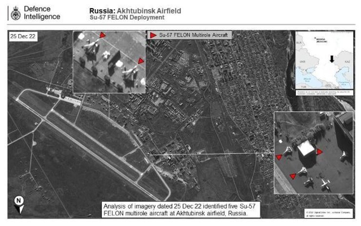 Отмечается, что Россия располагает несколькими авиабазами, на которых базируются ее самые современные истребители. По данным украинской разведки, полученным со спутниковых снимков, на авиабазе "Ахтубинск-7" в Астраханской области РФ находится множество современных многоцелевых истребителей Су-57.