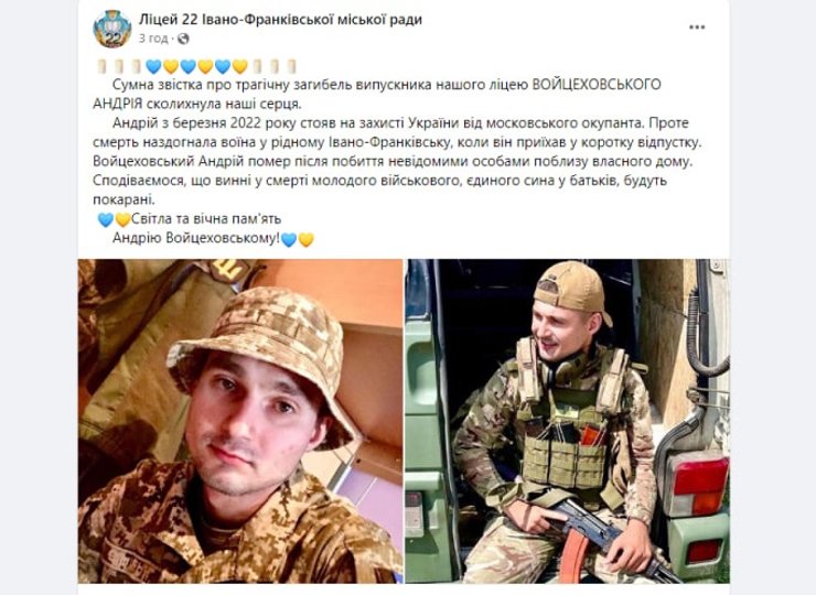 В Ивано-Франковске после избиения на улице неподалеку от собственного дома нашли тело 27-летнего военного Андрея Войцеховского. Парень приехал с передовой в родной город в отпуск. Об этом пишет "Галицкий корреспондент".