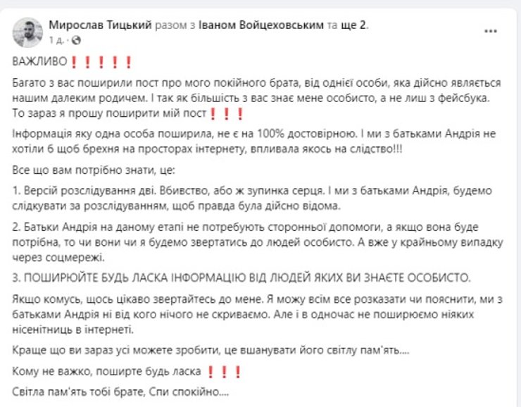 Как пишет брат Андрея Войцеховского Мирослав Тицкий в соцсети, версий расследования смерти две — убийство, или же остановка сердца.