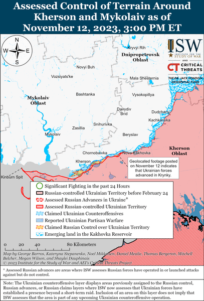 Аналитики ссылаются на российских военных блогеров, которые утверждают, что ВС РФ пытались и не смогли оттеснить украинские войска от Крынок. Силы обороны ведут наступательные операции у Поймы и Песчановки и перебросили дополнительный личный состав в район Крынок, чтобы перерезать российские линии материально-технического обеспечения и нанести удары по инфраструктуре, которая соединяет российскую линию фронта с тыловыми районами в оккупированном Крыму, Херсонской и Запорожской областях.