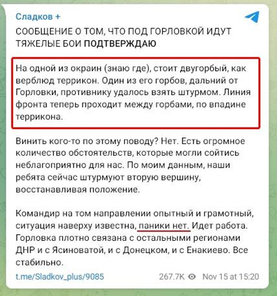 "На одной из окраин (знаю где) стоит двугорбый, как верблюд террикон. Один из его холмов, дальше от Горловки, противнику удалось взять штурмом. Линия фронта теперь проходит между холмами, по впадине террикона. По моим данным, наши ребята сейчас штурмуют вторую вершину, восстанавливая положение", — написал он.