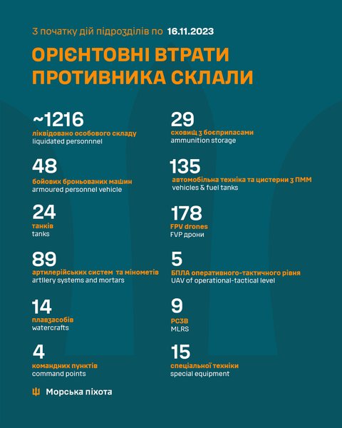 "В результате заранее спланированных мероприятий по отпору широкомасштабной вооруженной агрессии РФ, Силы обороны Украины провели серию успешных действий на левом берегу реки Днепр на Херсонском направлении. Благодаря мужеству и профессионализму украинским морским пехотинцам, во взаимодействии с другими подразделениями Сил обороны, удалось закрепиться на нескольких плацдармах", — говорится в сообщении.
