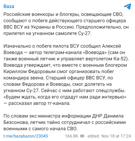 По легенде росСМИ, старший офицер Воздушных сил ВСУ якобы сотрудничал с оккупантами с начала полномасштабного вторжения. Украинская военная разведка называет это типичным вбросом из-за массовой сдачи в плен российских офицеров и пилотов с техникой.