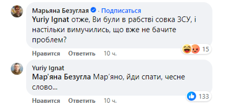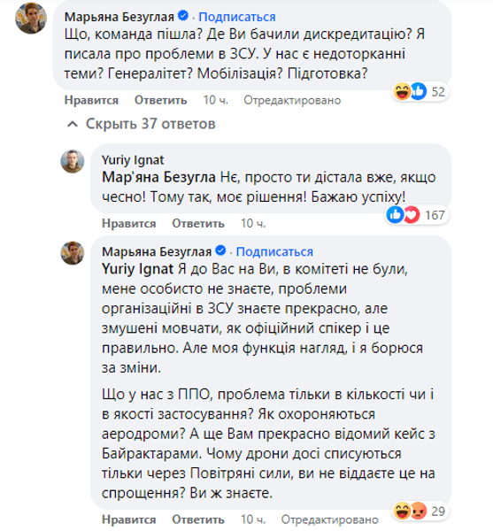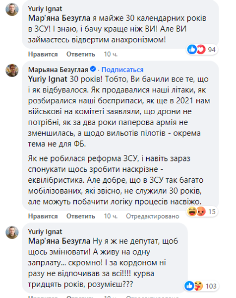 Далее "хейт" перенесся в комментарии под постом Игната, где Безуглая обвинила спикера ВС в том, что он получил команду "сверху". И спросила, есть ли неприкосновенные темы для обсуждения, такие как, к примеру, мобилизация. На это Игнат отметил, что удалил ее из друзей, потому что она "достала".