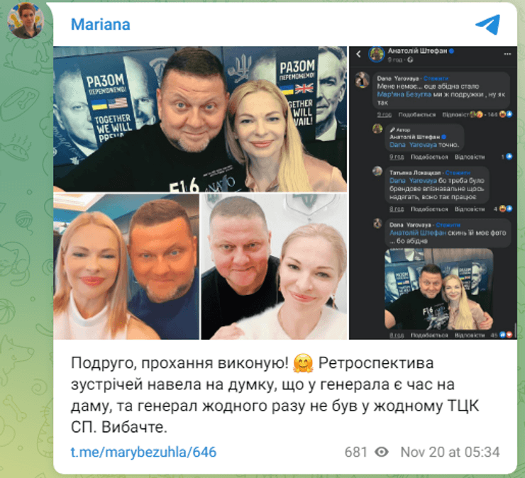 Далее Безуглая опубликовала пост с фото Залужного в компании члена Общественного антикоррупционного Совета при Министерстве обороны Даны Яровой и заявила, что "у генерала есть время на даму, но генерал ни разу не был ни в одном ТЦК и СП".