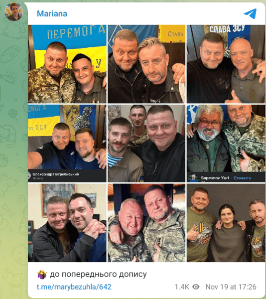 Следующим постом она опубликовала фотографии Залужного в компании, сомнительных, по ее мнению людей. Включая мэра Одессы Геннадия Труханова, экс-советника ОП Алексея Арестовича, харьковского предпринимателя, владельца Superior Golf Club и волонтера Юрия Сапронова и других.
