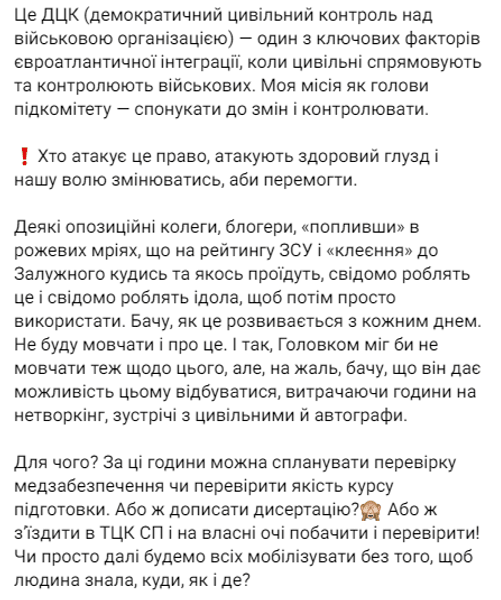 По словам зампреда Комитета ВРУ по вопросам нацбезопасности, обороны и разведки, у главнокомандующего ВСУ есть время на женщину, но нет времени на проверку работы ТЦК и СП. По мнению спикера Воздушных сил Юрия Игната, парламентарий занимается анахронизмом.