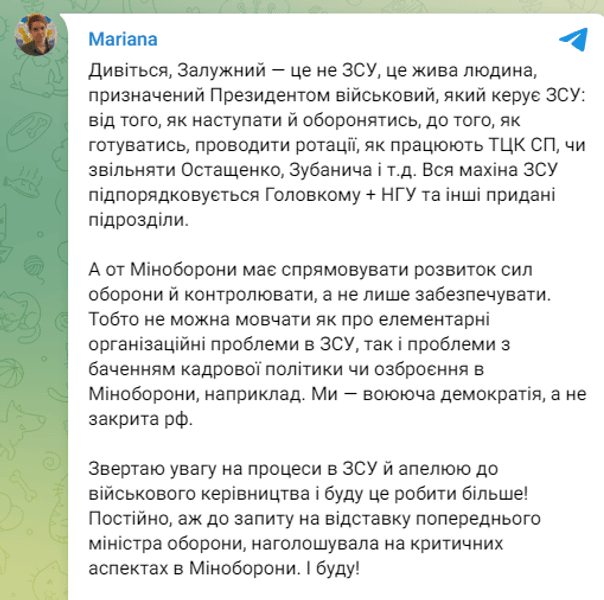 "Обращаю внимание на процессы в ВСУ и апеллирую к военному руководству и буду это делать больше! Постоянно, вплоть до запроса на отставку предыдущего министра обороны, подчеркивала критические аспекты в Минобороны. И буду! Это ДЦК (демократический гражданский контроль над военной организацией) — один из ключевых факторов евроатлантической интеграции, когда гражданские направляют и контролируют военных. Моя миссия как председателя подкомитета — побуждать к изменениям и контролировать. Кто атакует это право, атакуют здравый смысл и нашу волю меняться, чтобы победить", — написала Безуглая