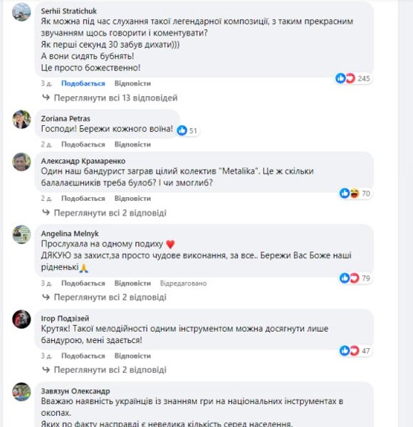 Украинский защитник на передовой сыграл рок-композицию Nothing Else Matters популярной американской группы Metallica на бандуре. Видео исполнения хита завирусилось в сети. Его обнародовал известный волонтер и украинский гонщик Алексей Мочанов.