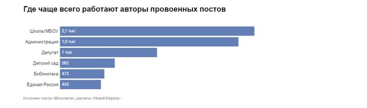 Анализ постов россиян показал, что доля бюджетников среди авторов провоенных постов (среди них место работы заполняли около трети пользователей) в разы больше, чем среди авторов случайных постов — контрольной группы, с которой журналисты сравнивали свои данные. В бюджетных учреждениях работают 67% копипастеров, 51% авторов уникальных провоенных постов и только 15% — среди авторов случайных постов.