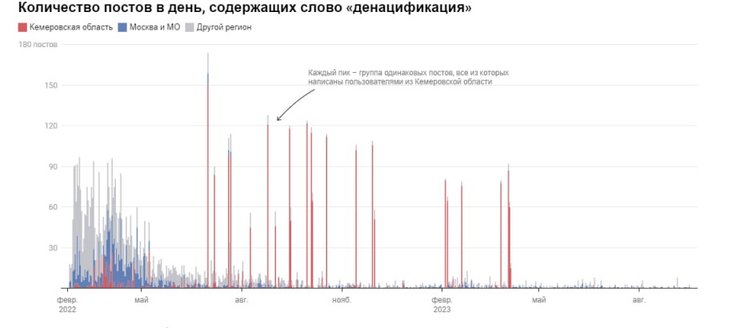 Например, в графике количество постов в день, содержащих слово "денацификация", можно увидеть много резких пиков. Каждый пик — группа одинаковых постов, все из которых написаны пользователями из Кемеровской области в один день.