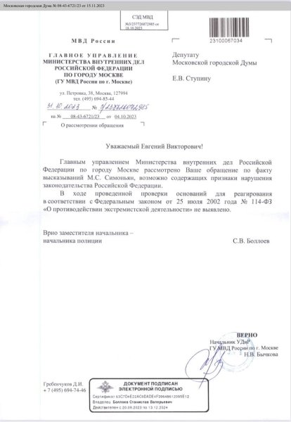 Российское МВД не нашло признаков экстремизма в словах главного редактора RT Маргариты Симоньян о ядерном взрыве над Сибирью. Ответ ведомства на запрос выложил в своем Telegram-канале депутат Мосгордумы Евгений Ступин.
