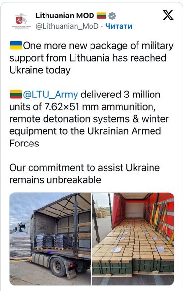 "Сегодня в Украину поступил еще один новый пакет военной поддержки от Литвы. Армия Литвы передала ВСУ 3 миллиона единиц боеприпасов калибра 7,62×51 мм, системы дистанционного подрыва и зимнее снаряжение. Наше обязательство помогать Украине остается незыблемым", — говорится в сообщении.