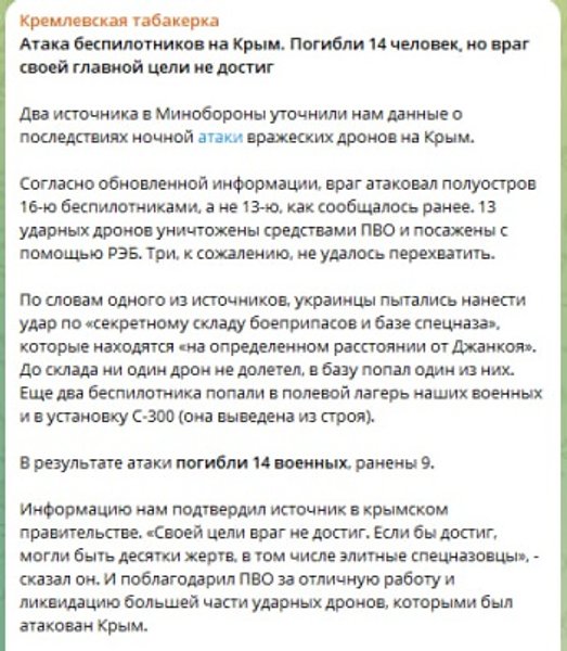 "До склада ни один дрон не долетел, в базу попал один из них. Еще два беспилотника попали в полевой лагерь российских военных и в установку С-300 (она выведена из строя). В результате атаки погибли 14 военных, ранены 9", — пишет "Табакерка".