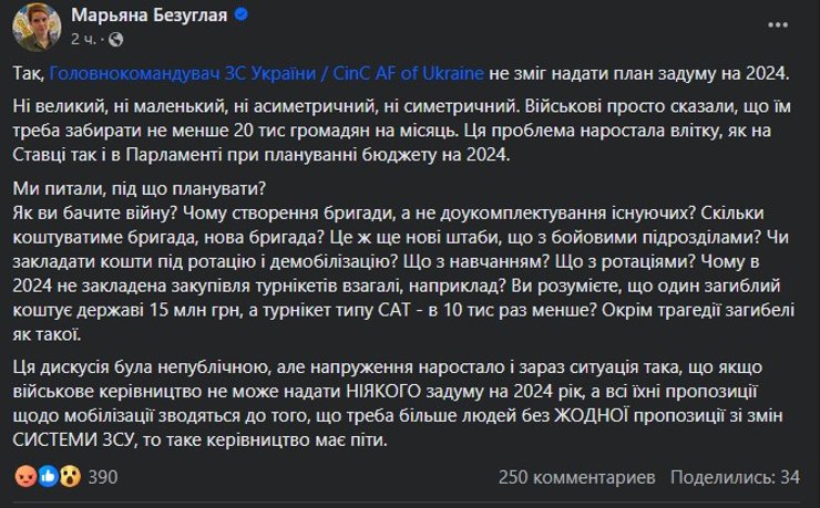 Народный депутат от фракции "Слуга народа" и член комитета национальной безопасности Марьяна Безуглая раскритиковала действия украинского высшего военного командования и, в частности, главнокомандующего ВСУ Валерия Залужного за то, что он "не смог предоставить" план войны на 2024 год. Свои претензии нардеп опубликовала 26 ноября в Facebook.