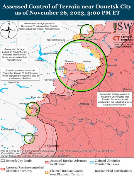 Военные блогеры РФ утверждали, что 26 ноября захвачена вся промышленная зона возле железнодорожной станции Ясиноватая-2, но ISW пока визуального подтверждения этих утверждений не нашел.