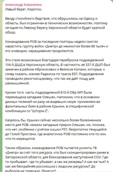 "Командование РОВ (российских оккупационных войск — ред.) за последние полторы недели смогло нарастить группу войск "Днепр" чуть более 68 тысяч и это очевидно, наращивание продолжится. Это стало возможным благодаря переброске подразделений 104-й ДШД в Херсонскую область. В частности, ее 337-й ДШП был замечен в районе Абрикосовки и и населенного пункта Большие Копани. Подразделения проводили разведку, что так же дает пищу для размышлений", — проинформировал эксперт.