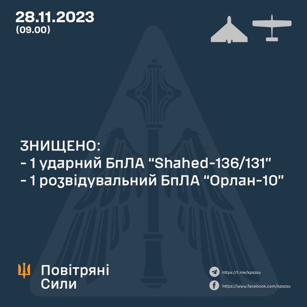 Этой ночью, 28 ноября, противовоздушная оборона уничтожила ударный беспилотников типа Shahed, а на утро на юге — разведывательный БПЛА оперативно-тактического уровня "Орлан-10". Об этом сообщили в Командовании Воздушных Сил ВС Украины.