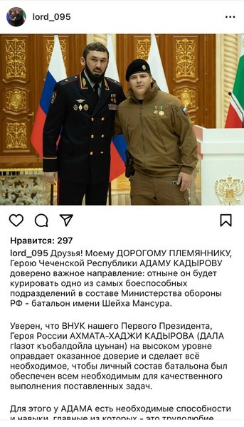 "Сегодня представил личному составу батальона имени шейха Мансура Министерства обороны РФ их нового куратора — героя Чеченской Республики, начальника службы обеспечения безопасности Главы ЧР Адама Кадырова. Это назначение стало закономерным результатом значительных заслуг Адама в деле отстаивания религиозных, семейных и культурных ценностей нашего народа", — написал он.