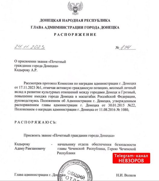 Также в сети сообщают, что Адам Кадыров стал почетным гражданином Донецка за "активную общественную позицию и весомый личный вклад в развитие культурных отношений между городами Донецк и Грозный".