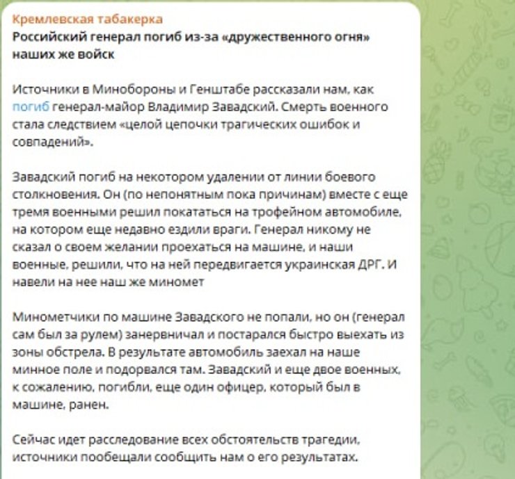 "Генерал, который сам сам был за рулем, занервничал и постарался быстро выехать из зоны обстрела. В результате автомобиль заехал на российское минное поле и подорвался там. Завадский и еще двое военных погибли, еще один офицер, который был в машине, ранен", — сообщает "Табакерка".