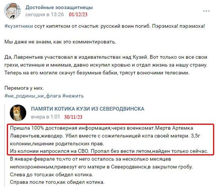 "Пришла 100% достоверная информация, через военкомат. Умер Артемка Лаврентьев, живодер. Убил вместе с сожительницей кота своей матери. 3,5 года колонии, лишение родительских прав. Из колонии напросился на "СВО". Пропал без вести летом, найден только сейчас", — говорится в сообщении.