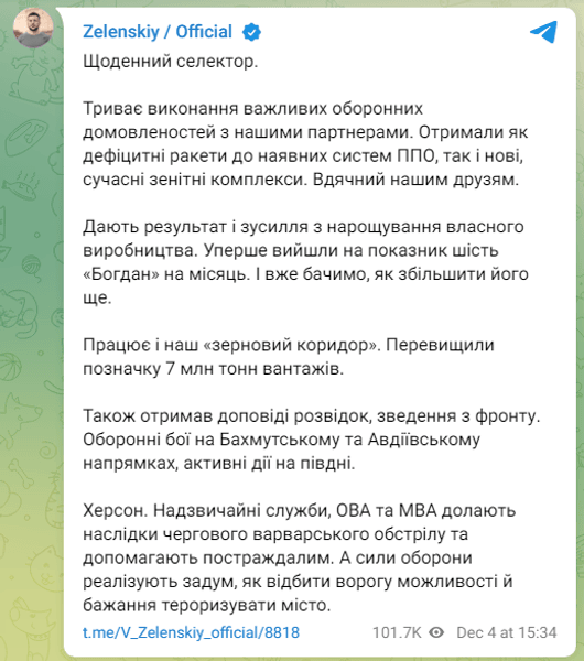 Кроме того, президент сообщил, о том, что Украина получила дефицитные ракеты к системам ПВО и современные зенитные комплексы.