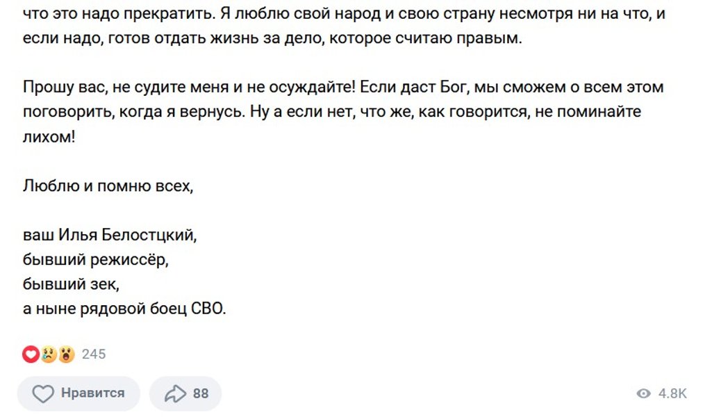 ВажноВ статье указывают, что Белостоцкий подписал контракт с Минобороны РФ и пошел воевать в Украину. Мужчина, находясь в колонии, объяснил своим сторонникам, какими были его мотивы. В частности, отметил, что считает себя невиновным, но не обижается на российские власти, которые его осудили.